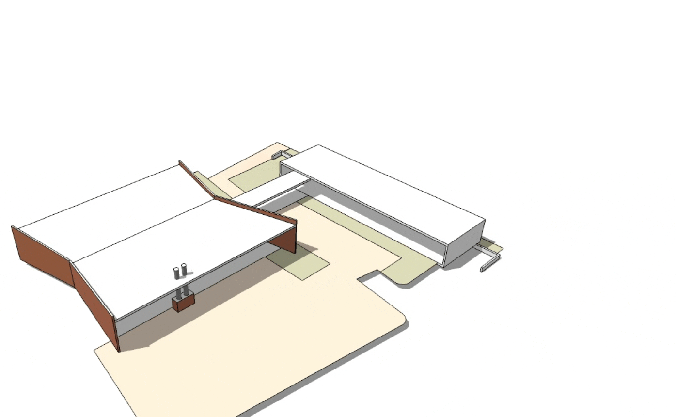 The formal strategy involves occupying the “airspace” above the existing administration wing with a new volume, rendered as delicately as possible, so as to maintain the primacy of the original building. A building, contemporaneous with the original Alumni House, was chosen as a precedent. The United Nations Headquarters, in New York, completed in 1952, to designs originated by Le Corbusier and executed by Wallace K. Harrison, was composed of a large figural pavilion for assembly and the Secretariat building, a slab office tower, to house administrative functions. The proposed Alumni House addition uses an analogous strategy. The expansion would take the form of a six-story addition built over the existing office wing, leaving the bow-tie-shaped assembly hall untouched. The new space would house meeting rooms and offices. A rooftop terrace would serve the occupants on a daily basis and provide space for occasional formal events. The preexisting administration wing would be repurposed as a hypostyle hall for exhibitions and assembly functions. A new operable glazed wall would open this space to the garden.